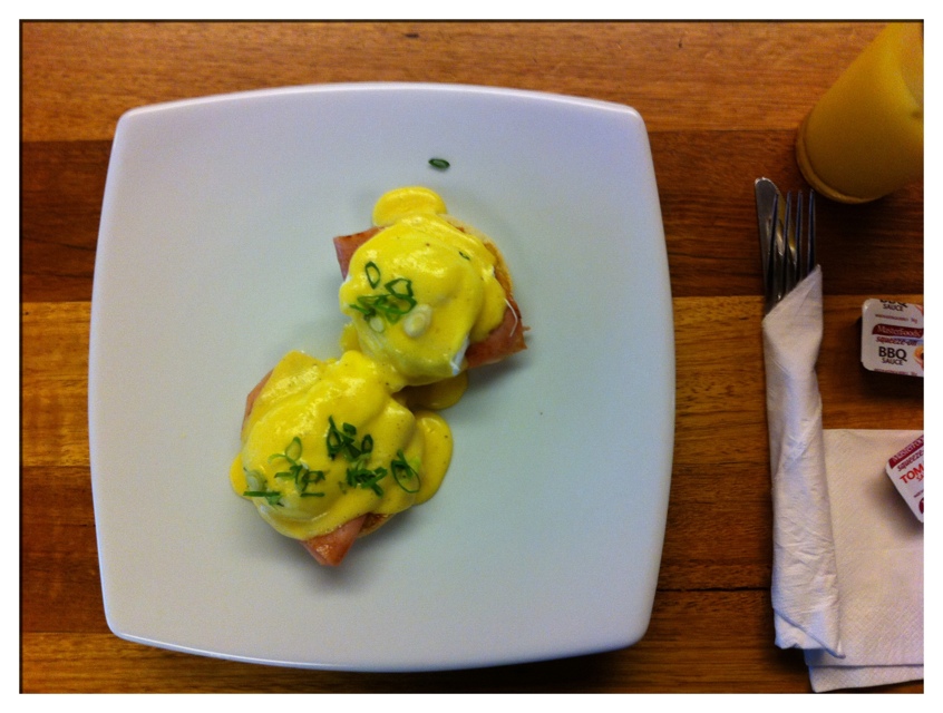 Moderato breakfast (vedi sotto, colori REALI) con egg benedict, ham, muffins (cosí chiamati per il sapore di muffa), il tutto annegato nella salsa bernaise: se il fegato ringrazia per il cibo, il frozen canned orange juice che ci ho bevuto sopra ha provocato l’entusiasmo del colon.