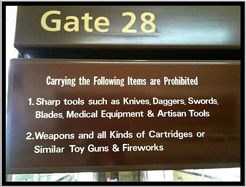 L’immagine sotto mi sembra appropriata se leggete il testo su cosa sia proibito portare a bordo. No, non vi dico in che aeroporto sia, ma metto in palio una pinta di Leffe Blonde per chi indovina!
