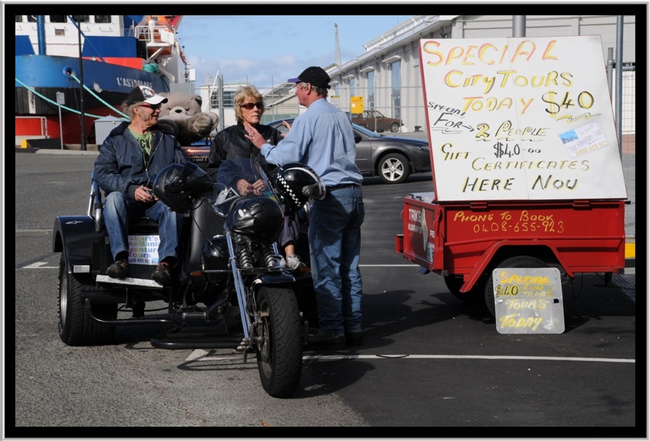 Vi offro due immagini sull’argomento: una Harley della Polizia di San Francisco fotografata nel 2009 e uno strano triciclo che prometteva emozionanti giri (poi certificati) vicino a Salamanca Sq. (Hobart, Tasmania), scatto di qualche settimana fà.