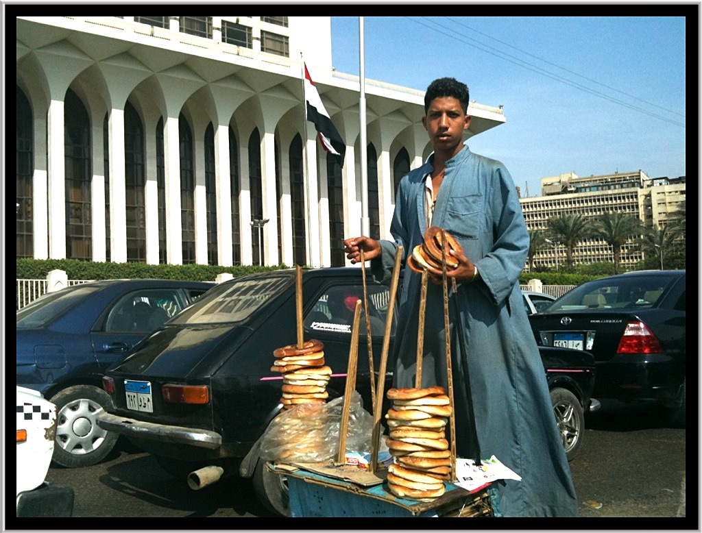 Vi metto qui una foto che ho scattato vicino a Tahrir Square, teatro principale delle proteste Egiziane (al Cairo, ovviamente): un venditore di pane è nel mezzo del traffico più troio, che contribuisce ovviamente ad insaporire l’alimento attraverso i gas di scarico densi come ghisa fusa. Per onestà intellettuale vi dico che è antecedente ai casini scoppiati, alla cacciata di Mubarak e alla presa del potere da parte dell’esercito. Ma non di tanto. Non chiedete nulla, tanto mi appello al V emendamento.