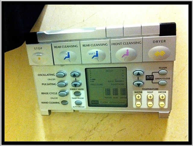 Senza entrare nei dettagli ho visitato nell’ordine: il cesso della longe, quello al gate d’imbarco, i 3 cessi dell’area business del 777 e uno dell’area First, il cesso al gate di arrivo a Dubai, quello nell’area ritiro bagagli, quello del check-in e, infine, quello ultratecnologico della lounge della Qatar (vedi immagine sotto), dove sono rimasto affascinato dalle funzioni “rear clean“, “front clean” and “dryer” cui destinerò apposito, specialistico post dal titolo “ars cacandi“, piuttosto che “Ave Cesare, cacaturi te salutant“. Un po’ di sfoggio nella cultura classica conferisce ai post un’aria così deliziosamente letteraria.