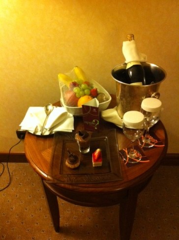 Mi commuovo trovando un “welcome kit” in camera e vedendo il gesto della bottiglia in ghiaccio (vedi foto), ma poi vengo riportato alla realtà: è succo d’uva rigidamente non fermentato. Saudi is a DRY Country.