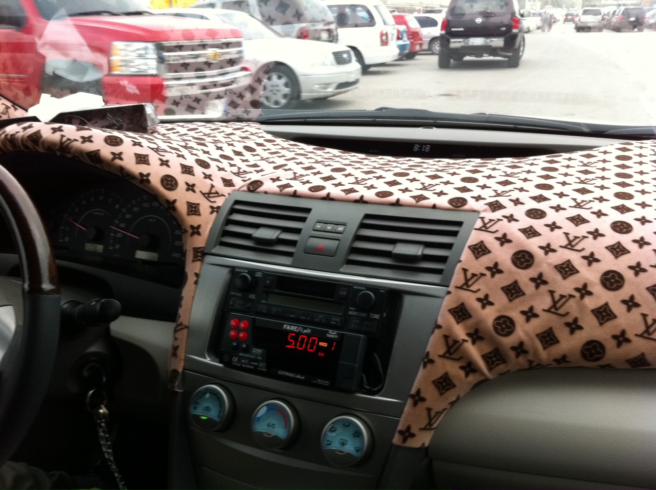 L’immagine di oggi? Ammirate la fine fake-LV-copertura del cruscotto del taxi che ho preso stamani dall’albergo all’ufficio. La stessa griffe poi veniva estesa su sedili e alette parasole. Un rosa-antico spettacolare ….