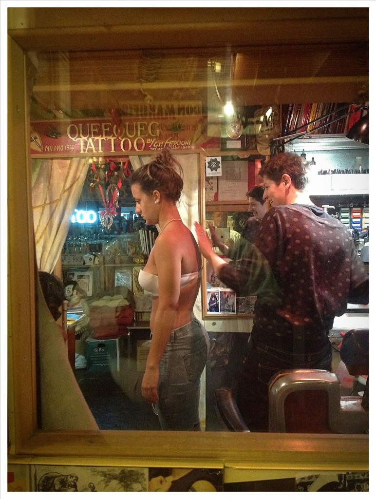 Oggi comunque ho trovato il modo e lo spazio di combinare una gran pirlata con la Cami: siamo andati da Fercioni (storico tatuatore milanese) e lei si è fatta scrivere una romanticissima frase con tonnellate di riferimenti e di ispirazione, io invece, dopo aver scartato le idee di farmi scrivere “Sale & Tabacchi” sulla fronte o “‘fanculo a tutto il mondo” in font 270 sul petto, ho celebrato il mio fascino aborigeno su un braccio.