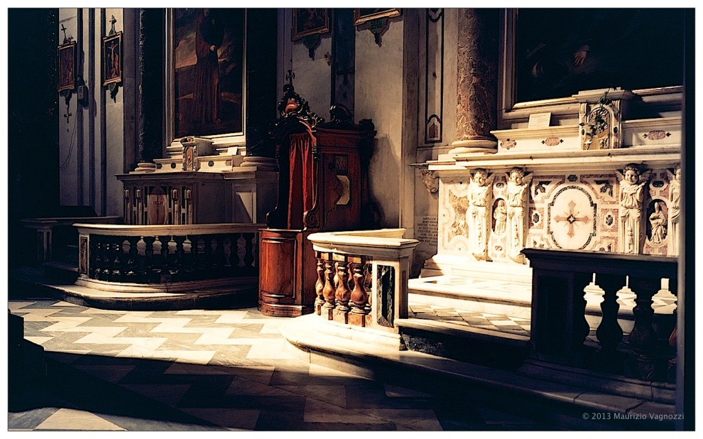 Stavo salendo verso la Spianata di Castelletto, e per arrivare a Piazza Portello sono passato davanti alla Chiesa di Santa Maria Maddalena, appunto nel Sestiere Maddalena. Aperta come quasi tutte le chiese di Genova, sono rimasto qualche minuto in totale solitudine a guardare le luci, le ombre e i colori: la tentazione di scattare una immagine usando la pellicola 400 ISO che ho in macchina รจ stata troppo forte, e sotto ne vedete il risultato. Ho fatto un solo scatto.