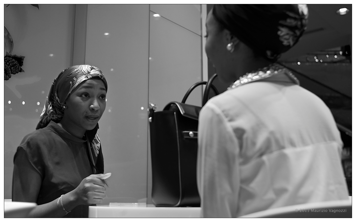 Ho aiutato due ragazze eritree che chiacchieravano a scattarsi una foto assieme con un iphone tempestato di lustrini d’oro, garantendomi il loro permesso per la possibilità di un paio di scatti “spontanei”. Poi mi son lasciato attrarre da un gran casino ottico creato da alcune scale mobili a specchio: di meglio oggi non riesco a fare, non ci son datteri per cammelli (traslitterazione locale e islamica del detto “non c’è trippa per gatti”) …