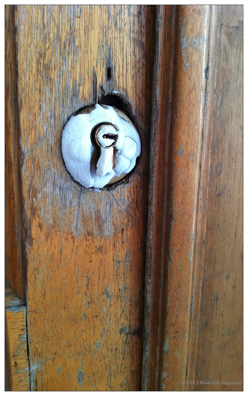 La serratura della mia camera d’albergo, fotografata dalla parte interna (verso la stanza): l’aria ghiacciata che penetra dal corridoio attraverso la serratura ha fatto condensare il vapore acqueo del mio respiro durante la notte. Vi lascio solo immaginare la temperatura della mia stanza, quella esterna era scesa sotto i -40°c. Ho avuto freddo la notte, credetemi: quando sono tornato a Beijing prima di ripartire verso London sono rimasto per oltre 40 minuti sotto una doccia calda, non riuscivo più a togliermi il gelo dalle ossa.