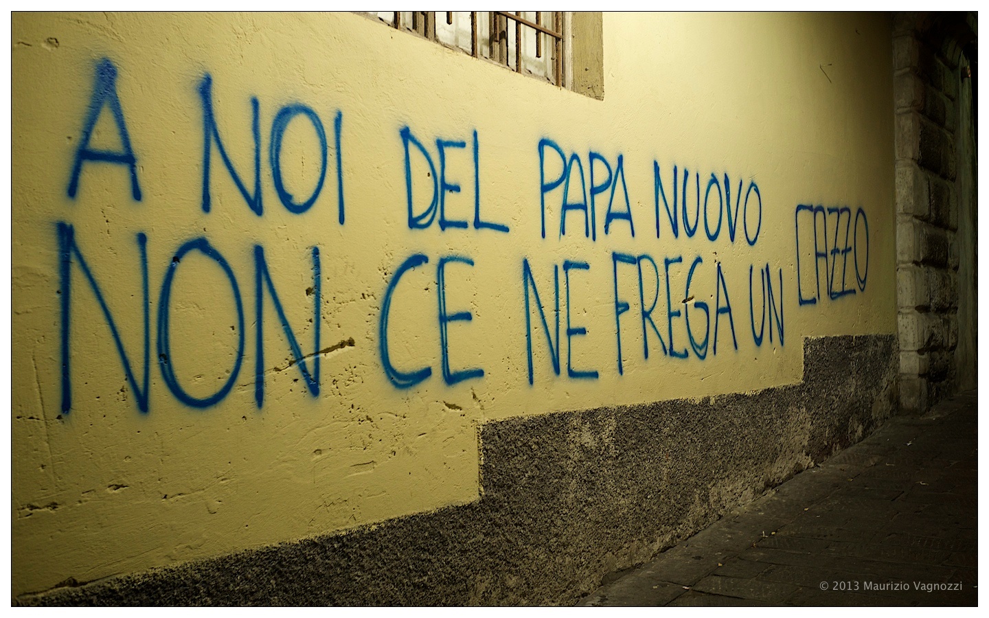Ho fatto due passi intorno a casa, alla ricerca di qualche messaggio incazzoso, di qualche “contrasto dialettico a colpi di bomboletta spry”, e devo dire che ho trovato ben poco da fotografare, se non una chiara posizione di “indifferenza” nei confronti del nuovo Pontefice che qualcuno ha sentito il bisogno di esternare in buona calligrafia e con lettere alte mezzo metro ….