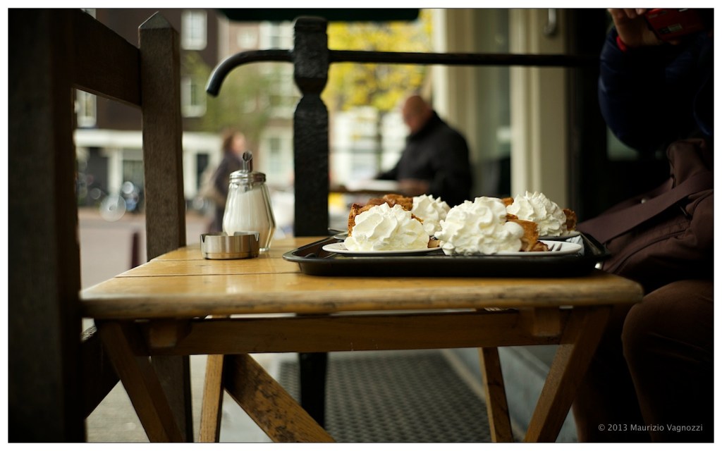 Luca è arrivato pedalando, promettendomi una bella camminata nella Amsterdam poco conosciuta, e un’apple-pie spettacolare. La camminata tra i canali mi ha fatto innamorare ancora di più di questo posto: devo tornarci per una seria vacanza di una decina di giorni per scorrazzare in bicicletta, la torta di mele con panna fresca montata invece mi ha portato all’estasi dal primo boccone.