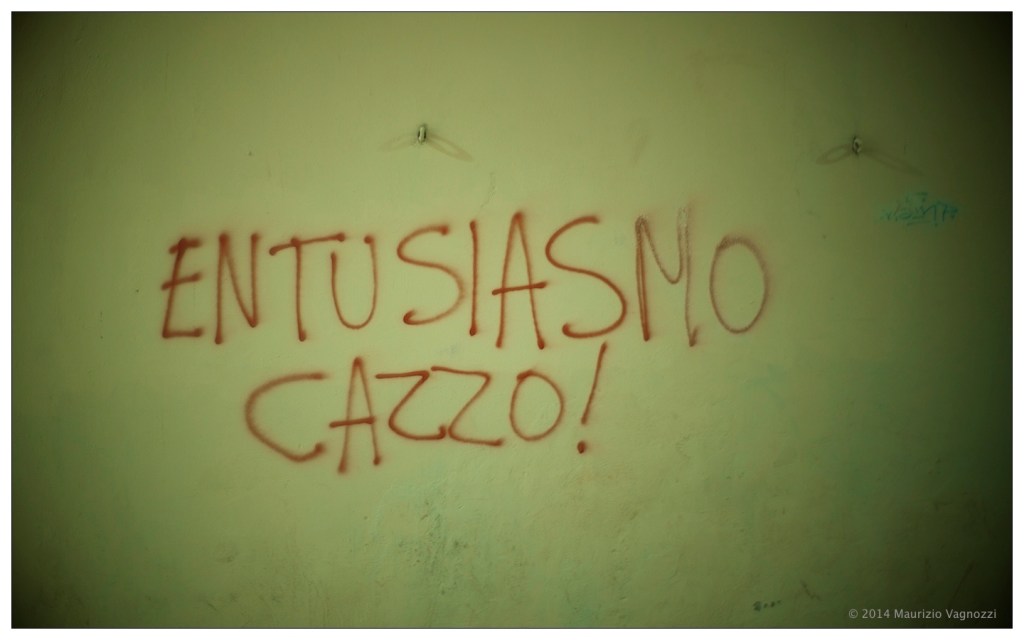 Certo che un filo di punteggiatura, tipo una virgola tra “entusiasmo” e “cazzo” aiuterebbe l’interpretazione: dovrei anche magari chiedere al graffitaro qualche nota esplicativa da aggiungere a commento ….