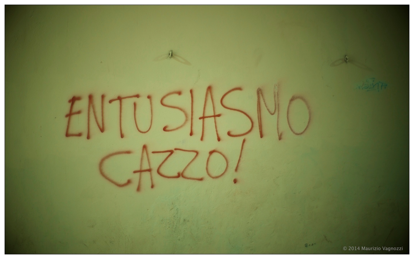 Certo che un filo di punteggiatura, tipo una virgola tra “entusiasmo” e “cazzo” aiuterebbe l’interpretazione: dovrei anche magari chiedere al graffitaro qualche nota esplicativa da aggiungere a commento ….