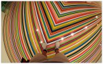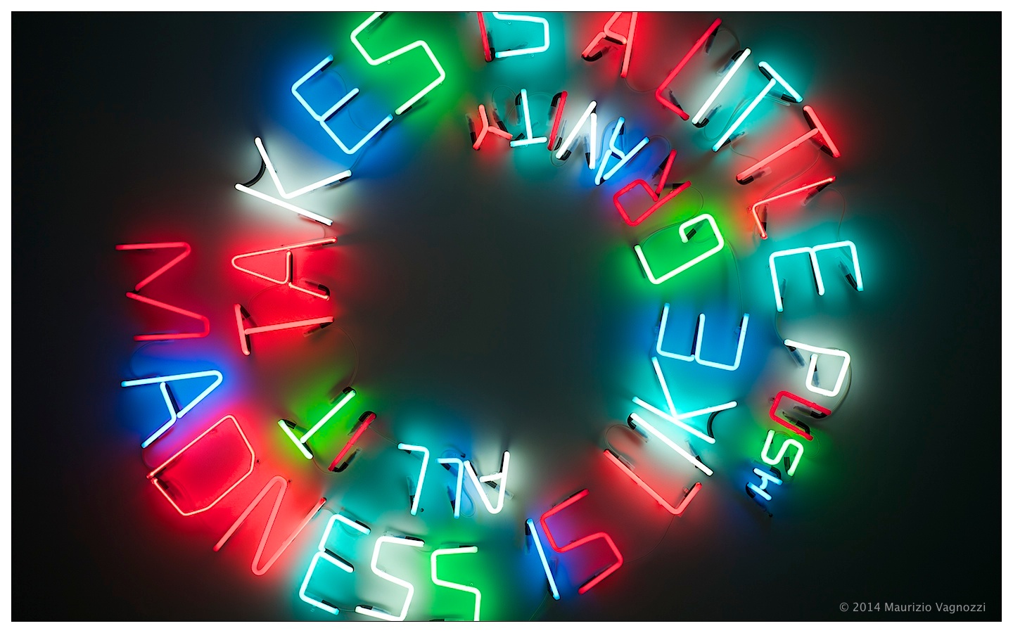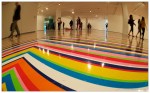 รย incredibile il pavimento del primo piano, realizzato da Jim Lambie con una quindicina di assistenti e volontari, ricoprendo quasi mille metri quadri di nastro adesivo colorato (vedi foto sotto). ย Douglas Gordon ci mostra un inquietante occhio che si apre nell’oscuritร di una sala con solo un pianoforte e specchi, TV Moore espone i suoi collage, e Roni Horn delle delicatissime grandi cisterneย di cristallo riempite d’acqua.ย “Madness is like gravity, All it takes is a little push” ci dice una scultura di neon colorati: La follia รจ come la gravitร , tutto quello di cui ha bisogno รจ una piccola spinta.