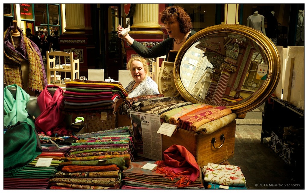 “Belle queste sciarpe, belle e si vede che arrivano dal subcontinente indiano e dall’Indocina“: sono sempre un inguaribile chiacchierone e, mentre faccio due passi dopo aver pranzato dentro il Leandenhall Market, non posso far a meno di fermarmi e curiosare tra le poche bancarelle che espongono originalità e passione.