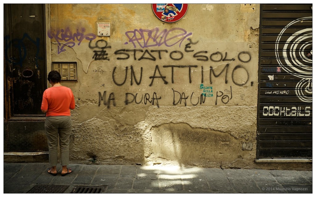 Esattamente un anno fa ho scattato una fotografia a una scritta che mi divertiva “È stato solo un attimo“: mi sono immaginato un incontro, una passione, un momento unico che non ha senso estendere oltre, per poterne cogliere la completa bellezza.