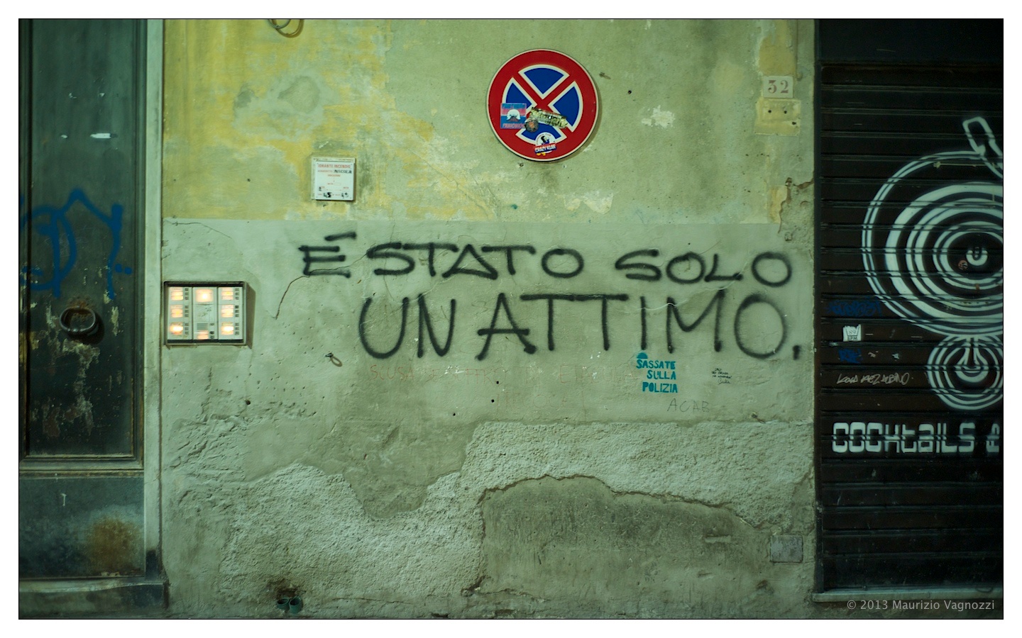 Esattamente un anno fa ho scattato una fotografia a una scritta che mi divertiva “È stato solo un attimo“: mi sono immaginato un incontro, una passione, un momento unico che non ha senso estendere oltre, per poterne cogliere la completa bellezza.