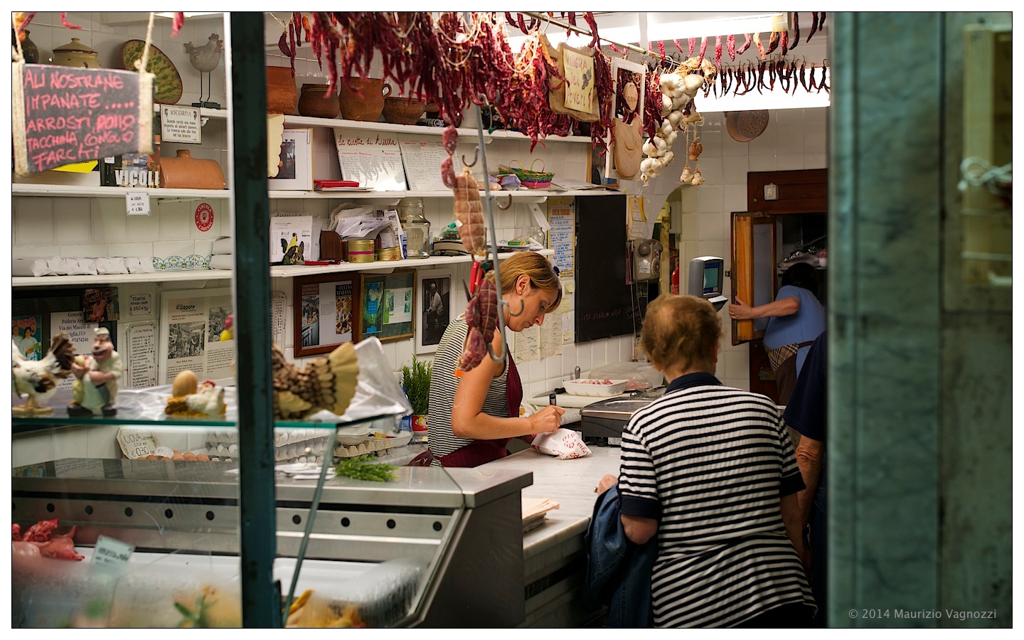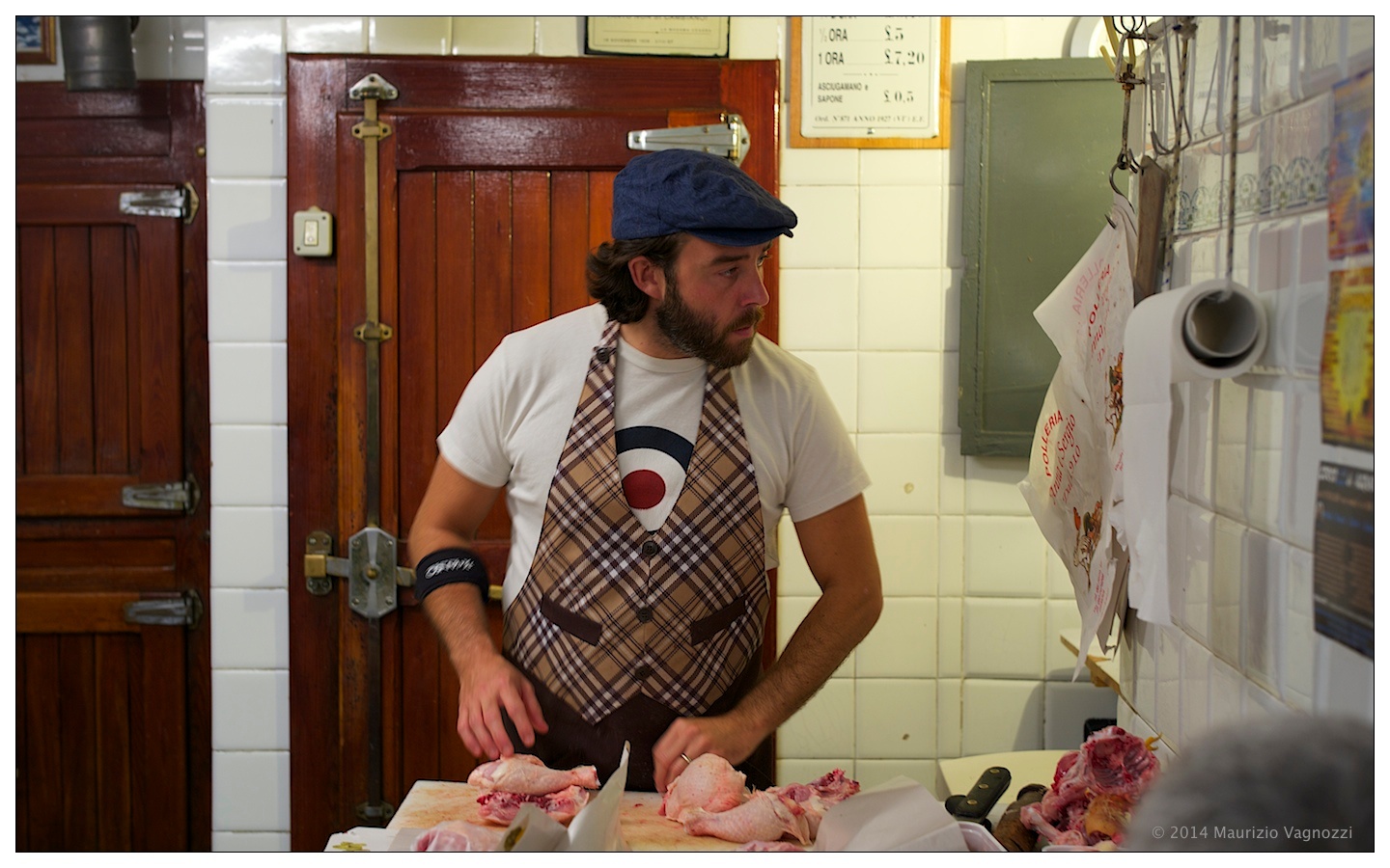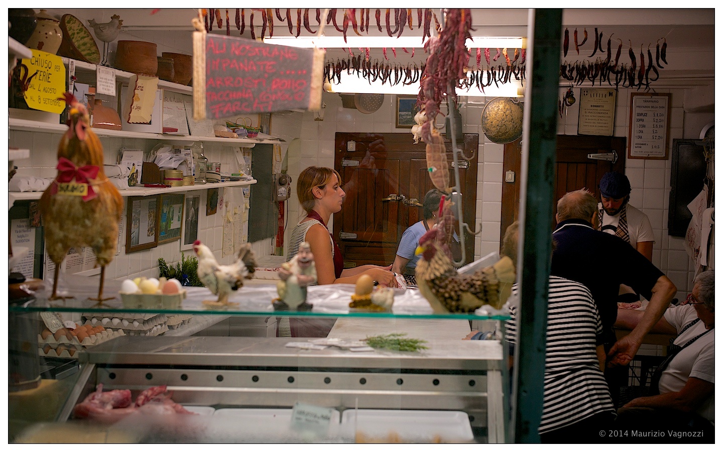 Sono andato a trovare un’amica che mi ha psicanalizzato, ascoltando la durezza delle scelte quando i miei fantasmi si palesano, e mi ha curato offrendomi un Chinotto Lurisia, che per inciso pare abbia avuto il suo logo col minatore e la fonte disegnato da mio nonno. Sono entrato di fronte, in polleria, e ho chiesto ridendo se potevo fare qualche foto mentre si chiacchierava di più, del meno, di creste, frattaglie e ali nostrane impanate e fritte. Mi casca l’occhio anche su un tariffario da bordello che descrive tempi e prestazioni, eredità di un tempo passato che da queste parti viene rinnovato da una presenza massiccia di prostituzione sudamericana.