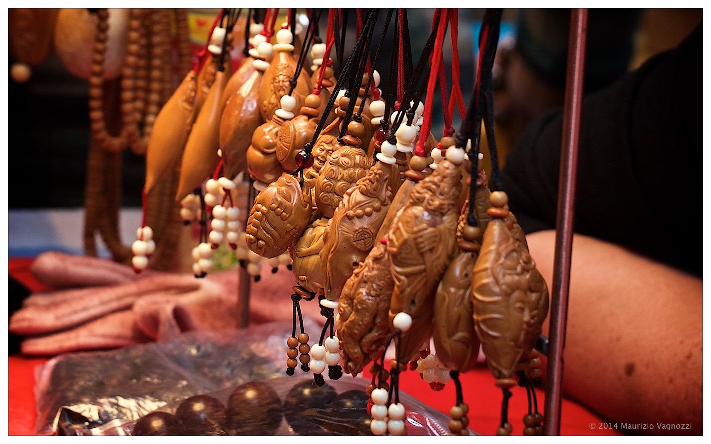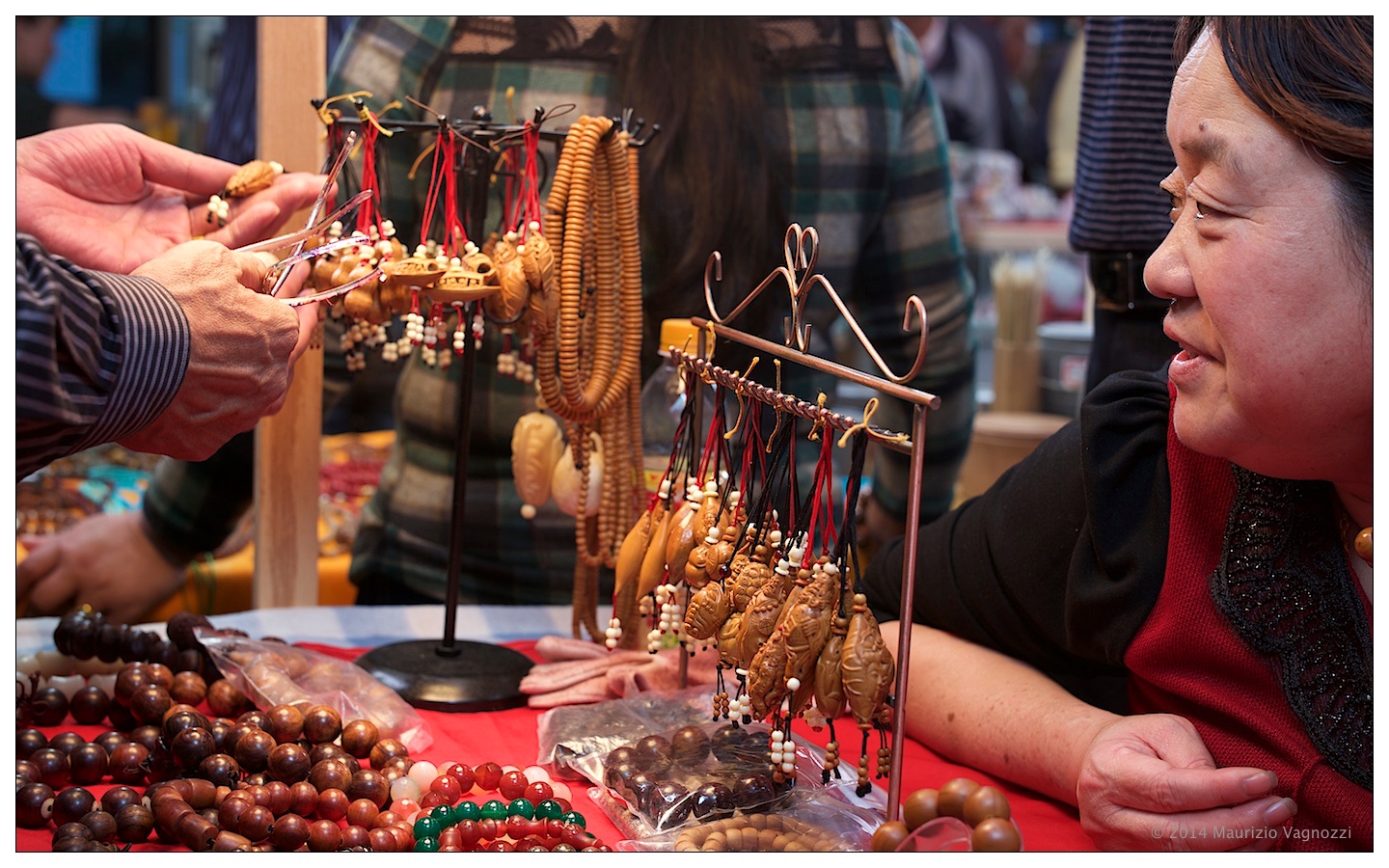 Foto? Qualche settimana fa, a Shanghai, dentro il Mercato dei Grilli: una donna che vende monili ricavati dalla lavorazione delle noci, guardate che dettagli …