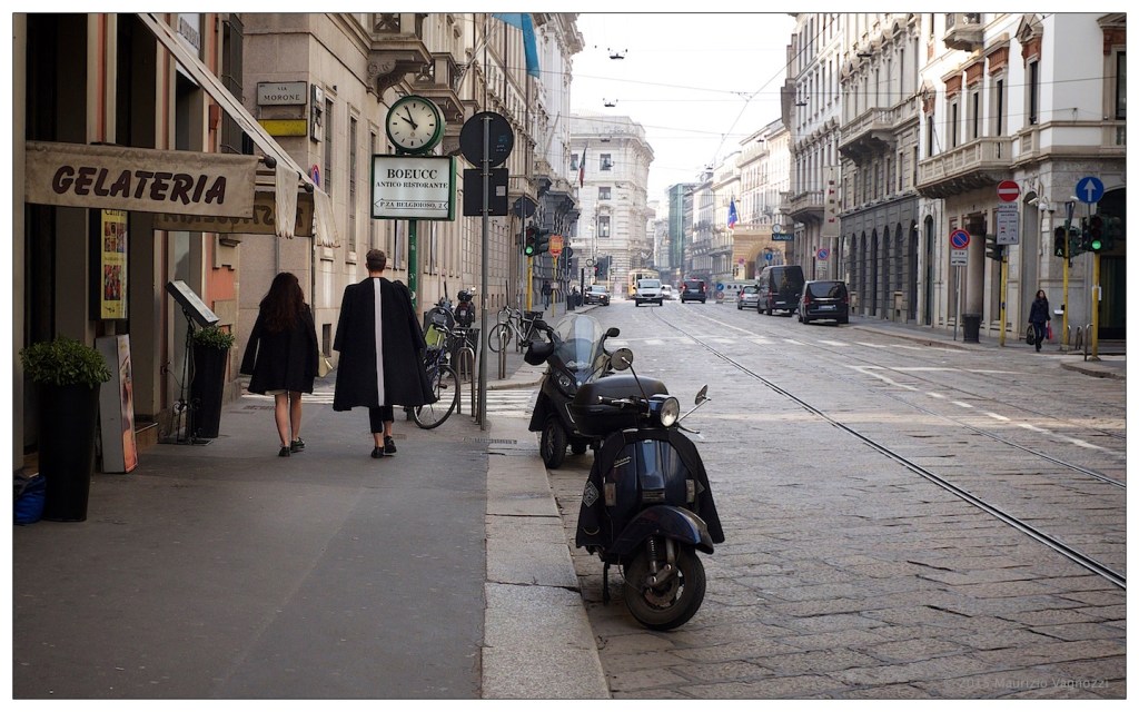 Lascio alle spalle Piazza Cavour e imbocco via Manzoni, camminando assieme a due persone abbigliate in modo un filo inconsueto: lui con un mantello nero, con una striscia bianca verticale sulla schiena e una casacca sulla quale erano intarsiate delle libellule, lei con un trequarti nero e un corto abito bianco: entrambi senza calze.