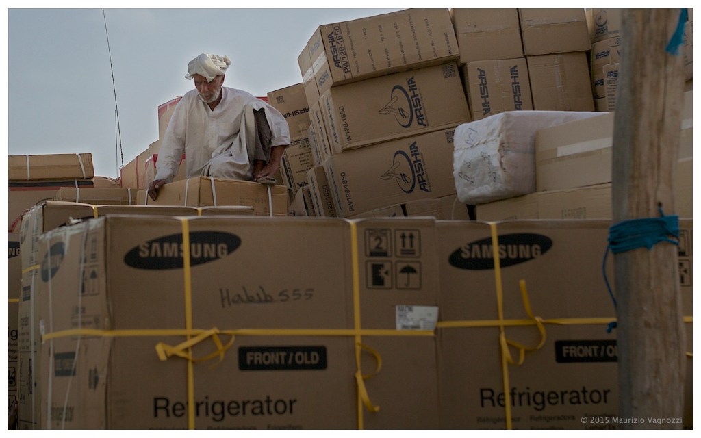 Salam aleiku Sheik, what the hell are you doing sitting on top of a refrigerator pile?” gli chiedo sorridendo e osservando un volto segnato dalla fatica della vita per mare nei porti del Golfo e poi giù fino alla Somalia.