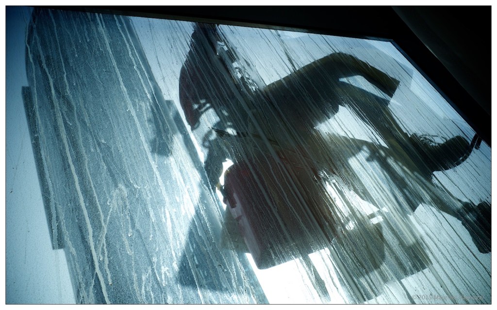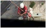Una corda doppia li cala in formazione parallela, in quattro o cinque a squadra. Affidano all’imbracatura le loro vite e si appendono spatole, secchi e ventose. Stamattina li ho visti scendere. Li ho aspettati, e una dozzina di scatti mi sono scappati …