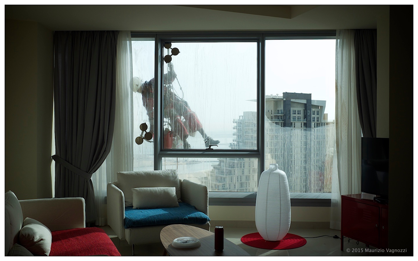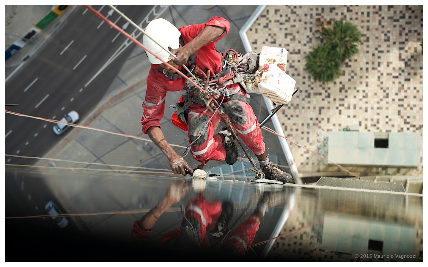 “Che lavoro fai?” “Lavo i vetri. I vetri delle torri. Sono uno sky-climber“.