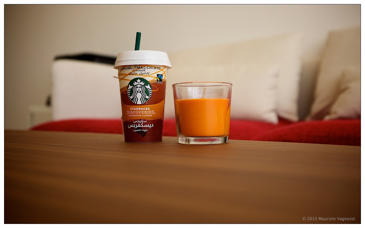 Stavolta mi son lasciato tentare dal surrogato del mio caffellatte nella catena che preferisco sul pianeta, Starbucks: ho trovato sugli scaffali tra il latte a sinistra e i succhi freschi di frutta e verdura della Barakat, un paio di bicchieri con del “Caramel Macchiato” dentro un “ready to use” dal packaging con colori caldi tipici della strategia di comunicazione della casa di Seattle.