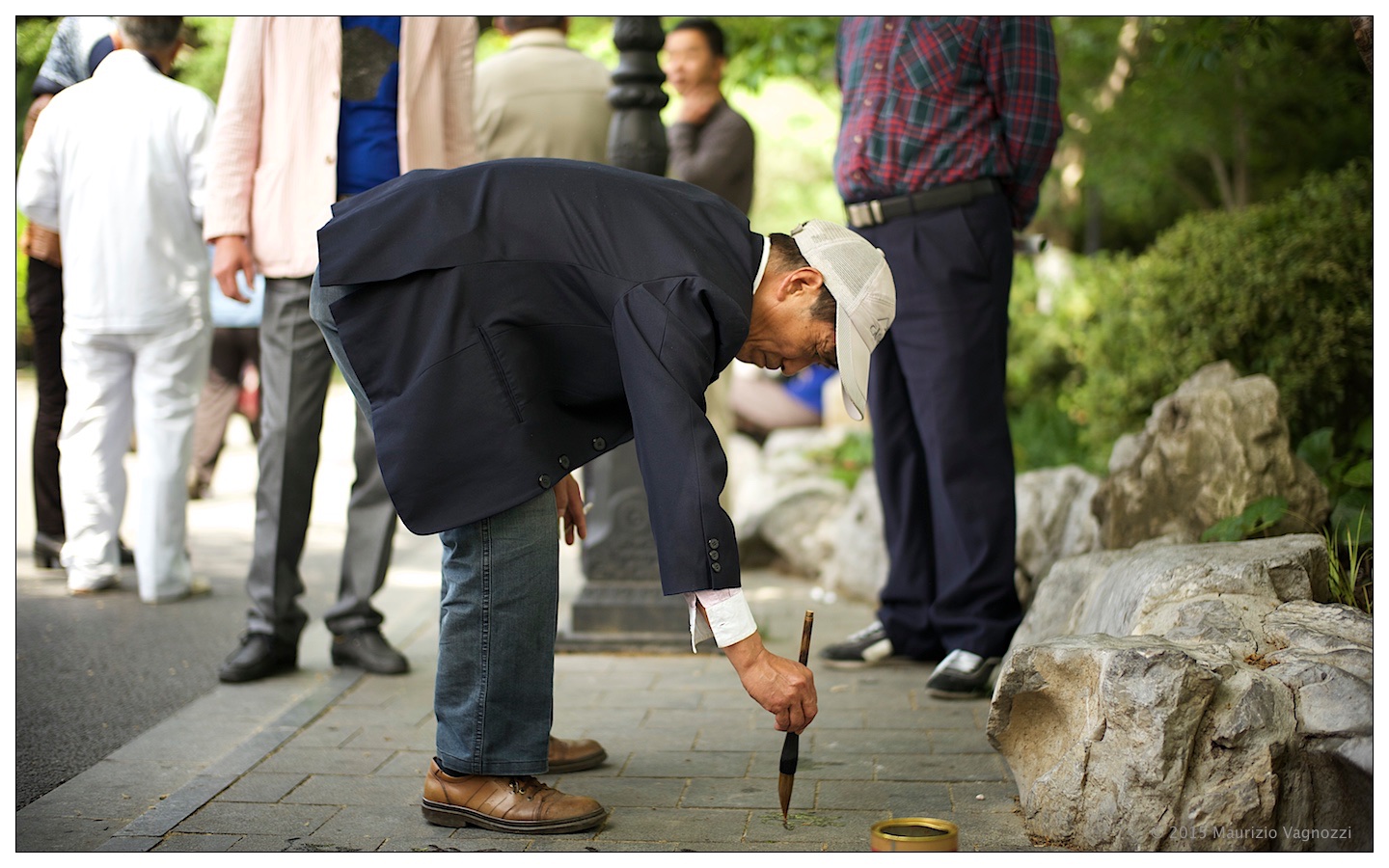 C’è chi fa una sorta di “chinese aerobics” con ritmi a noi sconosciuti e rappresenta figure di gruppo, quasi sincronizzate a parte qualcuno che perde un filo i colpi, ma va bene lo stesso così. C’è chi si esercita nella scrittura, dipingendo con il pennello e l’acqua sul marciapiede e insegna ai bambini una tradizione stilistica che dura da millenni.
