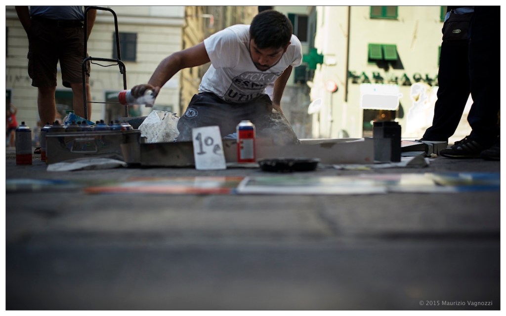 Supero il capannello di gente in San Lorenzo e comincio a intravedere i paesaggi psichedelici tipici della “spray art”: piramidi, tramonti/albe, cascate da Avatar e altro assortito, realizzato con una serie di bombolette di vernice spray e l’ausilio di qualche maschera o oggetti per trascinare il colore.