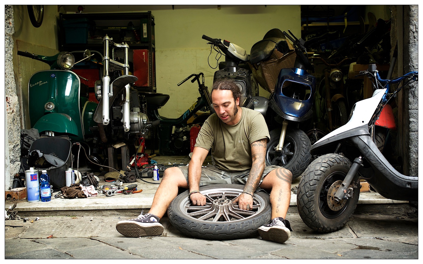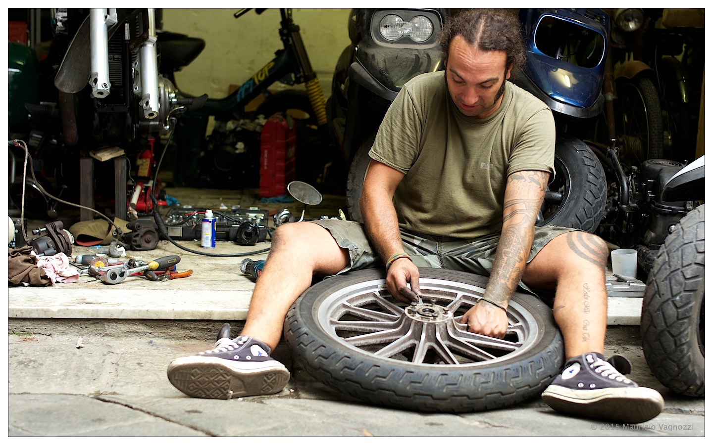 Sono alcune ore che lo vedo lรฌ a sfregare un cerchione. Seduto in terra non nega una parola a chi passa: “lo zen e l’arte della manutenzioneย della motocicletta” ambientato nei carruggi e applicato a una realtร della Cittร Vecchia di Genova dopo che un temporale ha spento un po’ laย canicola umidiccia.