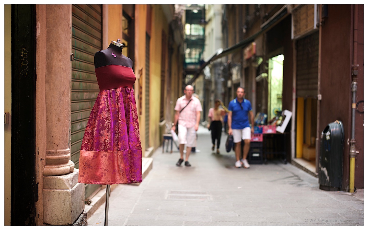 Mentre stavo ascoltando le strofe cercando di capire chi altro oltre a me possa amare la loro musica, un manichino, in elegante contrasto con il plancton umano-estetico dei carruggi, ha attirato la mia attenzione: come non fotografarlo con la Signora Tedesca a telemetro aprendo prima a f 2.4 e poi a f 1.7, sfuocando naturalmente tutto il resto?