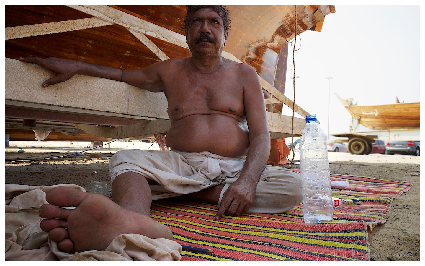 Lavorano in due sulla barca 107, mentre un terzo si riposa all’ombra della 128. Uno va di scalpello e l’altro assiste diligentemente: nel senso che proprio sta a guardare il “maestro d’ascia” che, lasciatemi dire, non sta certo prendendosi alcuna fretta nel portare avanti il lavoro. Certo, il clima non aiuta, ma questa è flemma storica impiantata nel DNA a colpi di sostituzione delle eliche più importanti con dei comodi cuscini dove sdraiarsi.