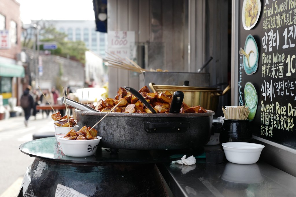 Pratico lo street food (il mangiare per strada quello che la tradizione locale ti offre) come una religione, e anche qui in Korea non ho potuto astenermi: sto gustando veramente di tutto, e con eccellente soddisfazione. Un encomio solenne per alcuni spiedini di manzo che hanno meritato l’applauso a scena aperta, dei waffles a forma di pesce ripieni di fagioli rossi caramellati, e delle patate saltate con un sugo di maiale che hanno fatto da rimbocco del breakfast dopo aver girato in lungo e in largo Buchon Hanock.