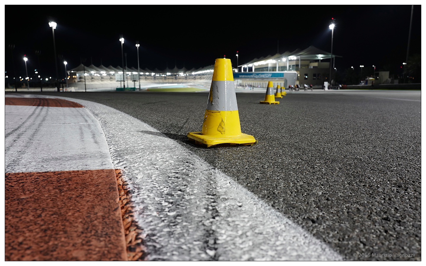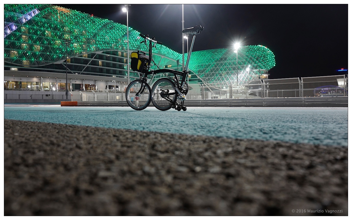 Ero in cima alla collina che porta poi verso l’anfiteatro che vede alle sue spalle il Ferrari World e che costeggia l’area delle tribune che fanno anche da accesso/uscita di chi sta frequentando il circuito. Ho buttato la Leica dentro la borsa da manubrio, ho “spiegato” la bici (sto usano la pieghevole Brompton, “Black Revolution” in vista del BWC) e mi son lanciato nella follia.