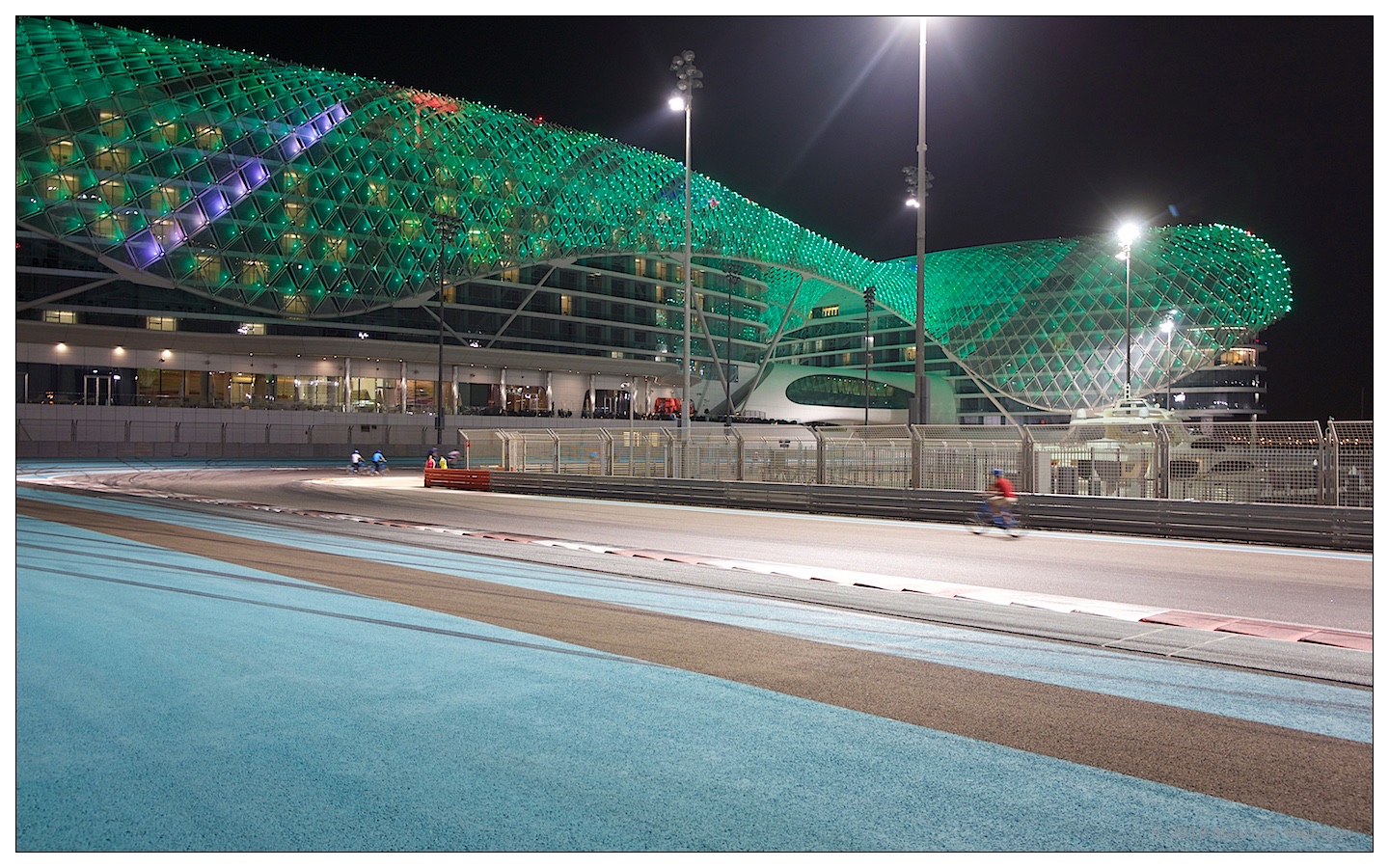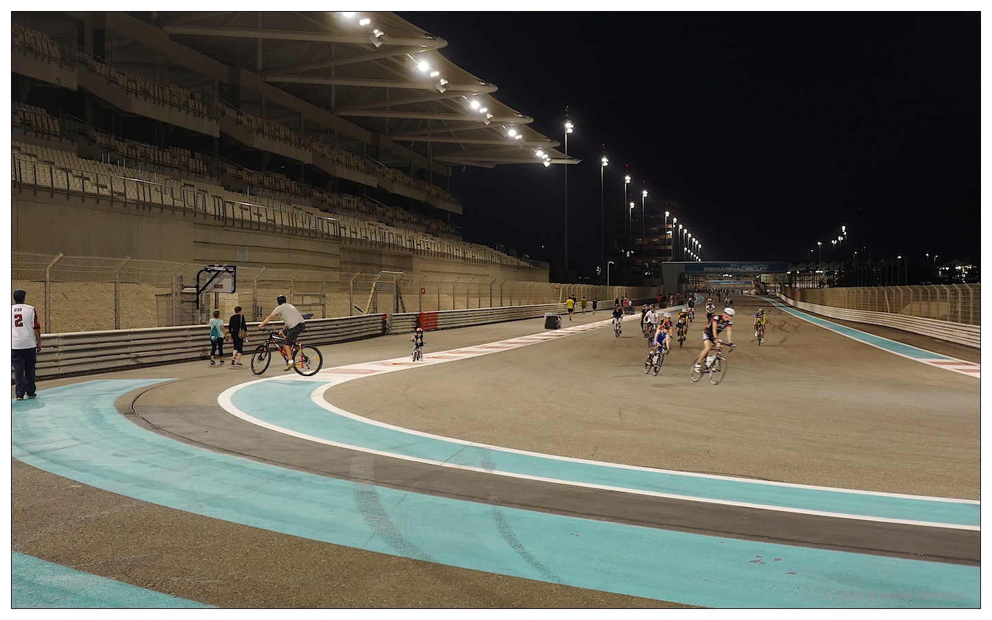 Stasera dopo l’ultima call alle 19:30 sono andato a pedalare nel circuito di Yas Island che, ogni martedรฌ sera, apre le porte a chi voglia correre o percorrere in bicicletta i suoi 5 e passa chilometri di asfalto perfetto, garantendo organizzazione, assistenza, soccorso, e acqua.