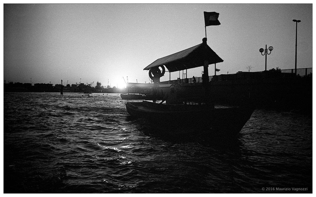 Foto? Una decina di giorni fa ho preso l’autobus che collega Abu Dhabi con Dubai (25 dirhams, 6 euro) e sono andato ad aspettare un amico che passava da queste parti cui avevo chiesto “vuoi rimanere nel blasonato zoo artificiale o vuoi vedere un pizzico di realtà“, e noncurante della sua risposta l’ho trascinato nel tramonto sul creek mentre avevo una pellicola 100 iso in macchina …
