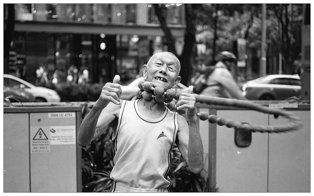 Anche l’altro giorno, dopo il temporale mentre risalivo Orchard a mettermi l’appetito giusto per andare a fotografare il tempio dello spiedino grigliata per strada (vedi LAU PA SAT di qualche giorno fa), ho trovato un ragazzino ottantenne incartapecorito che per ore faceva ruotare diverse collane di palle di legno, chiedendo un obolo alla sua abilità.