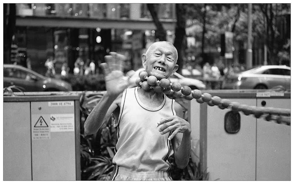Anche l’altro giorno, dopo il temporale mentre risalivo Orchard a mettermi l’appetito giusto per andare a fotografare il tempio dello spiedino grigliata per strada (vedi LAU PA SAT di qualche giorno fa), ho trovato un ragazzino ottantenne incartapecorito che per ore faceva ruotare diverse collane di palle di legno, chiedendo un obolo alla sua abilità.