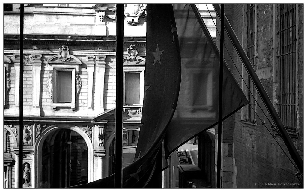 And my spirit is crying for leaving“, lo scanner mi ha restituito un’immagineΒ che ho scattato qualche settimana fa a Milano, fuori da Palazzo Mercanti, con una bandiera dell’Europa.