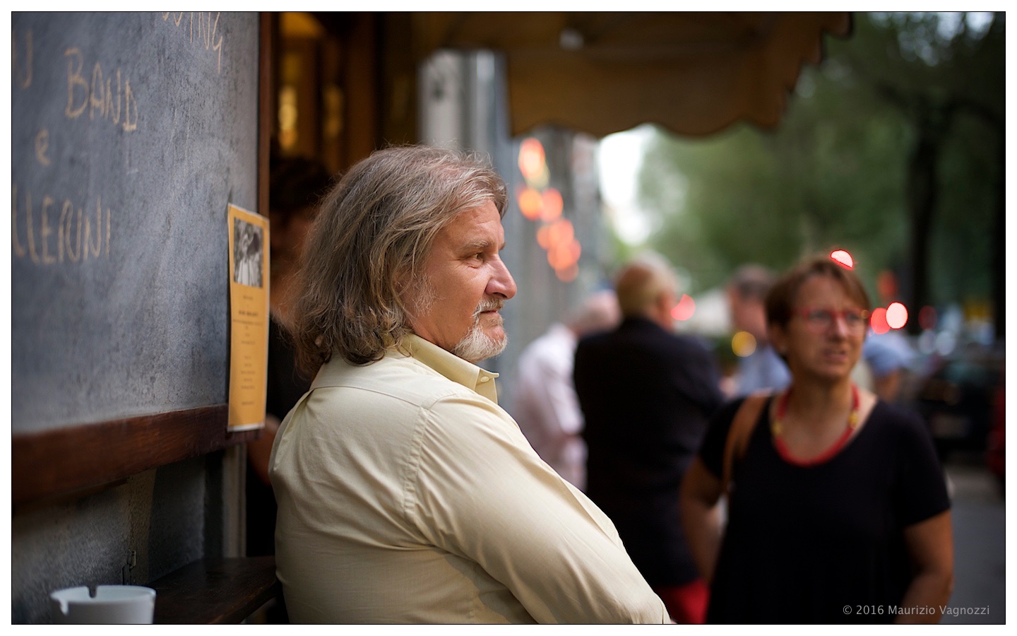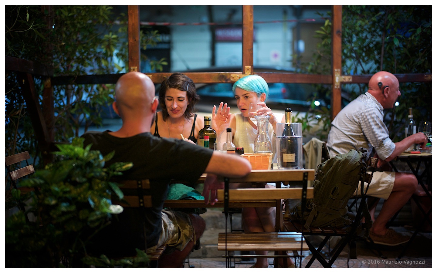 I capelli azzurri danno un tocco psichedelico alla serata, tra qualche bicchiere e molte parole: è immediato il ritorno al colore nella mia fotografia, e ringrazio il vetro “lux” che incunea la luce dentro verso il sensore e mi lascia giocare nel realizzare quasi qualsiasi cosa voglia con la Signora Tedesca a Telemetro.