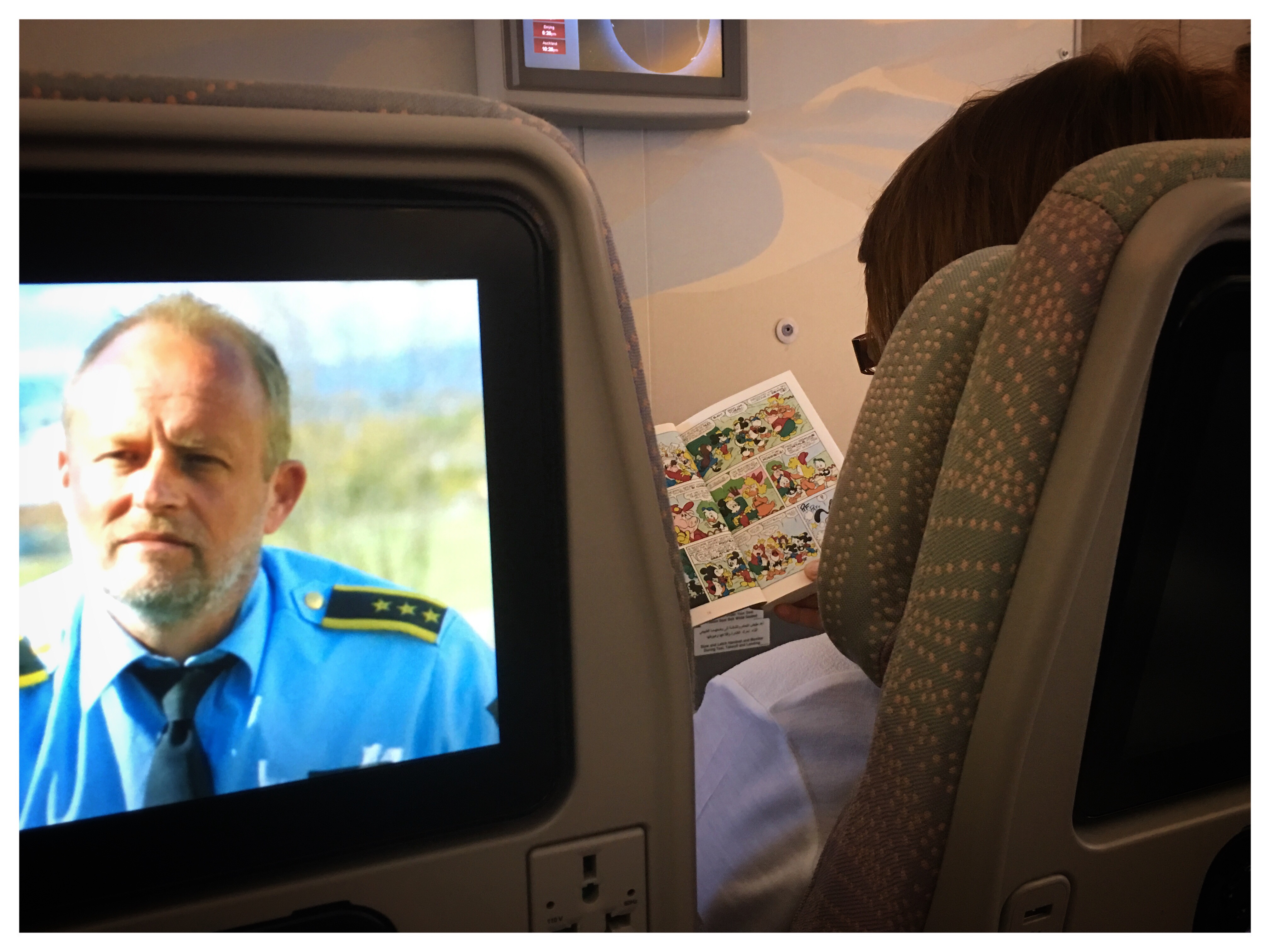 La passeggera nella fila davanti alla mia si stava godendo la lettura di un Topolino, piacere che io penso di aver abbandonato almeno 50 anni fa!
