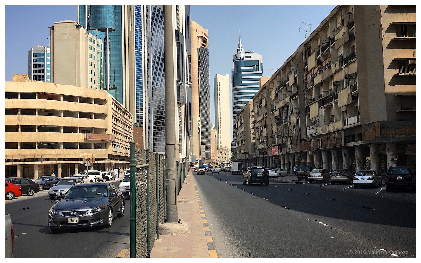 Lunga introduzione per spiegare che negli ultimi 5/7 anni Kuwait City sta cambiando radicalmente: il fiume di dollari in arrivo sta rimpiazzando i palazzi fatiscenti costruiti nella seconda metร degli anni ’60 e negli anni ’70 con nuove architetture verticali, in una riqualificazione completa della cittร . Restano ancora pochi edifici con i segni dell’occupazione, e il contesto urbano sta cambiando velocemente spesso con nuove realtร che si affiancano a quelle vecchie senza soluzione di continuitร .