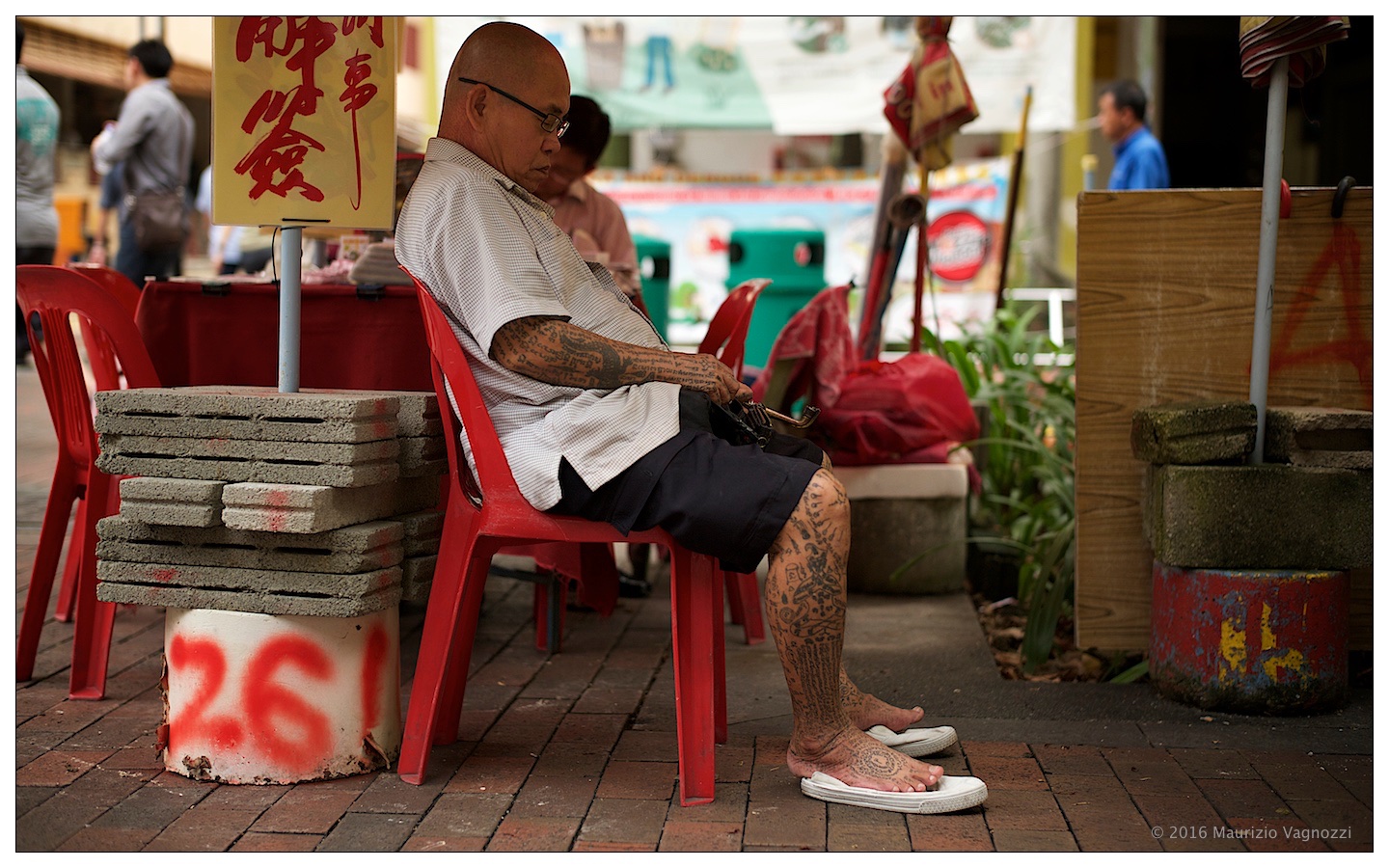 Percorrere le strade che da Little India attraversano Bugis, accanto a un’affollato Food Court, ti permette anche di farti predire la fortuna, e leggere il diaframma impostato sull’obiettivo e tempo dell’otturatore: ovvio che con un f2 e un 2-millesimo di secondo tu possa cogliere qualche interessante particolare come quello di un Fortune-Teller addormentato …