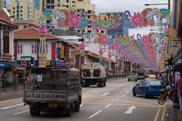 Raccatto un paio di sciarpe: e’ il mio tributo alla nostra amicizia che dura dagli anni ’80 quando vendeva orologi falsi su Orchard Rd. Gli apro a ventaglio qualche banconota e lui ne prende una, tra le più basse in valore tra quelle a corso legale nella Città Stato, e aggiunge “E adesso vieni ad assaggiare i dolci che facciamo per il Deepavali, qui nell’alley accanto“.