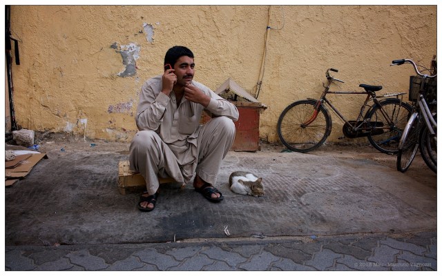 È un universo quasi esclusivamente maschile. Uomini seduti a bere il tea, uomini che aprono le botteghe, uomini al telefono, in una lingua che sa di montone arrosto e delle montagne brulle nelle valli del Pakistan. Uomini nelle panetterie, nelle caffetterie, nelle macellerie, nelle saracinesche che lentamente si aprono, in un brulicare di commercio al minuto che sfida le leggi dell’economia.