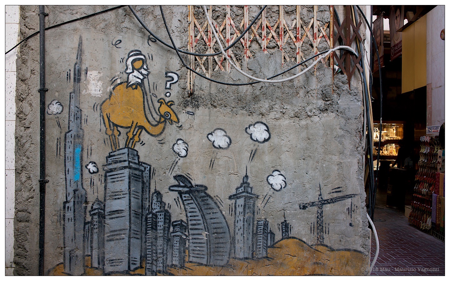 Un murales simboleggia lo sparire di questa area della città: collocato in una viuzza che lascia per poche decine di metri il turistico Gold Suck, appannaggio di torpedoni di turisti Cinesi e da Sovietici sovrappeso ustionati, disegna palazzi che sorgono istantaneamente dalla sabbia, lasciando perplesso un cammello e il suo beduino [vedi foto sotto].