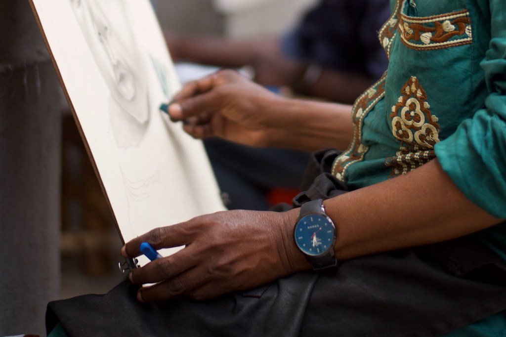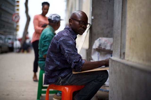 Lo lascio armeggiare sul suo Nokia che risale alle Guerre Puniche e mi avvicino a un paio di tipi che stanno disegnando, curiosamente con la faccia e la tela rivolti verso il muro. Entrambi realizzano ritratti, partendo da fotografie, e aggiungendo quello che definirei uno “stile pop-Nieto”, a credito di Agustino Nieto che ha guidato il Paese fuori dal colonialismo Portoghese. Rinuncio all’inglese e allo spagnolo: alzo la Signora Tedesca a Telemetro e annuisco con un’aria innocua. Abbassano la testa entrambi, accettando che tracci il mio ricordo, lasciando il compito al magico vetro Summilux, mentre aspettiamo che, nuovamente, Caronte arrivi per scaricarci da qualche altra parte in Africa.
