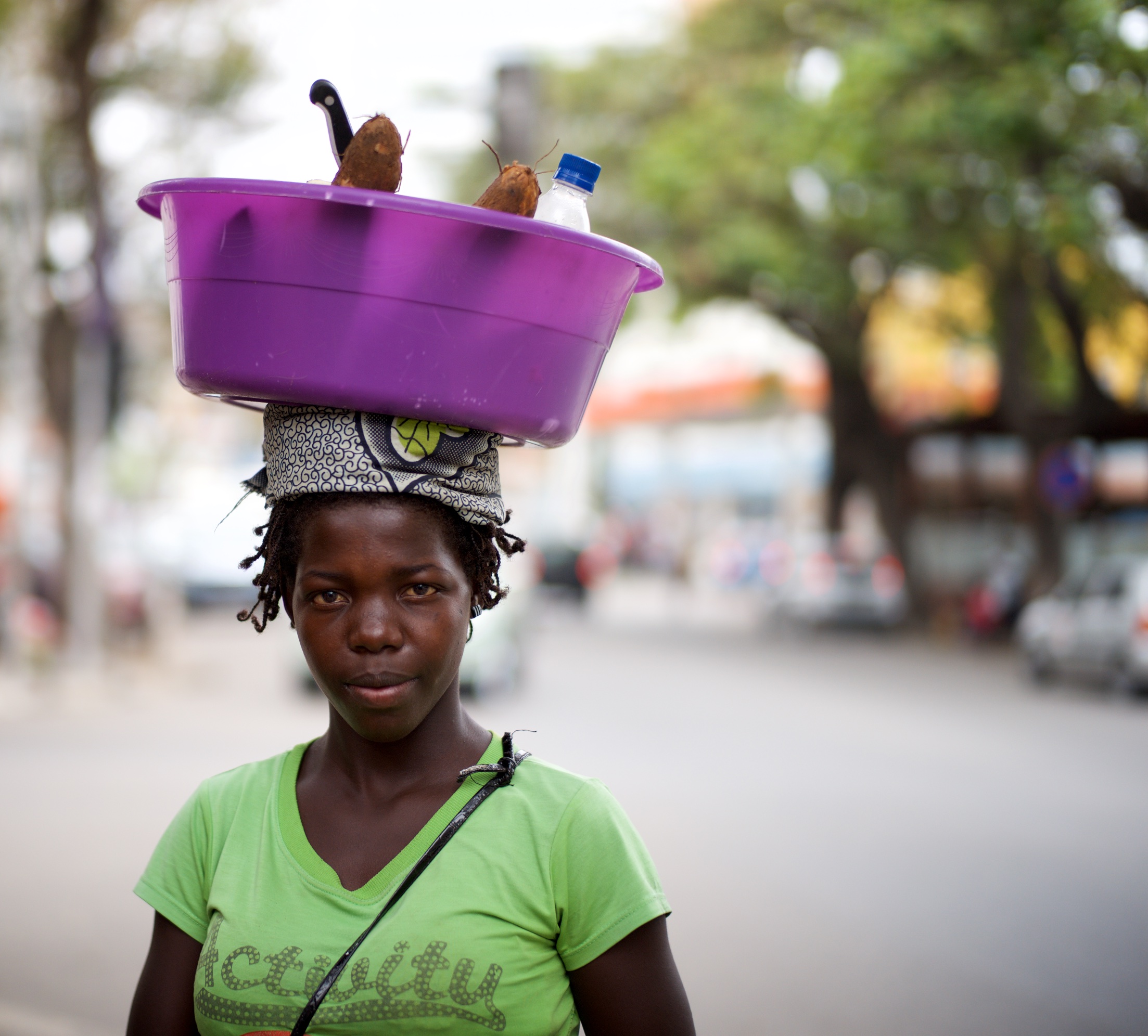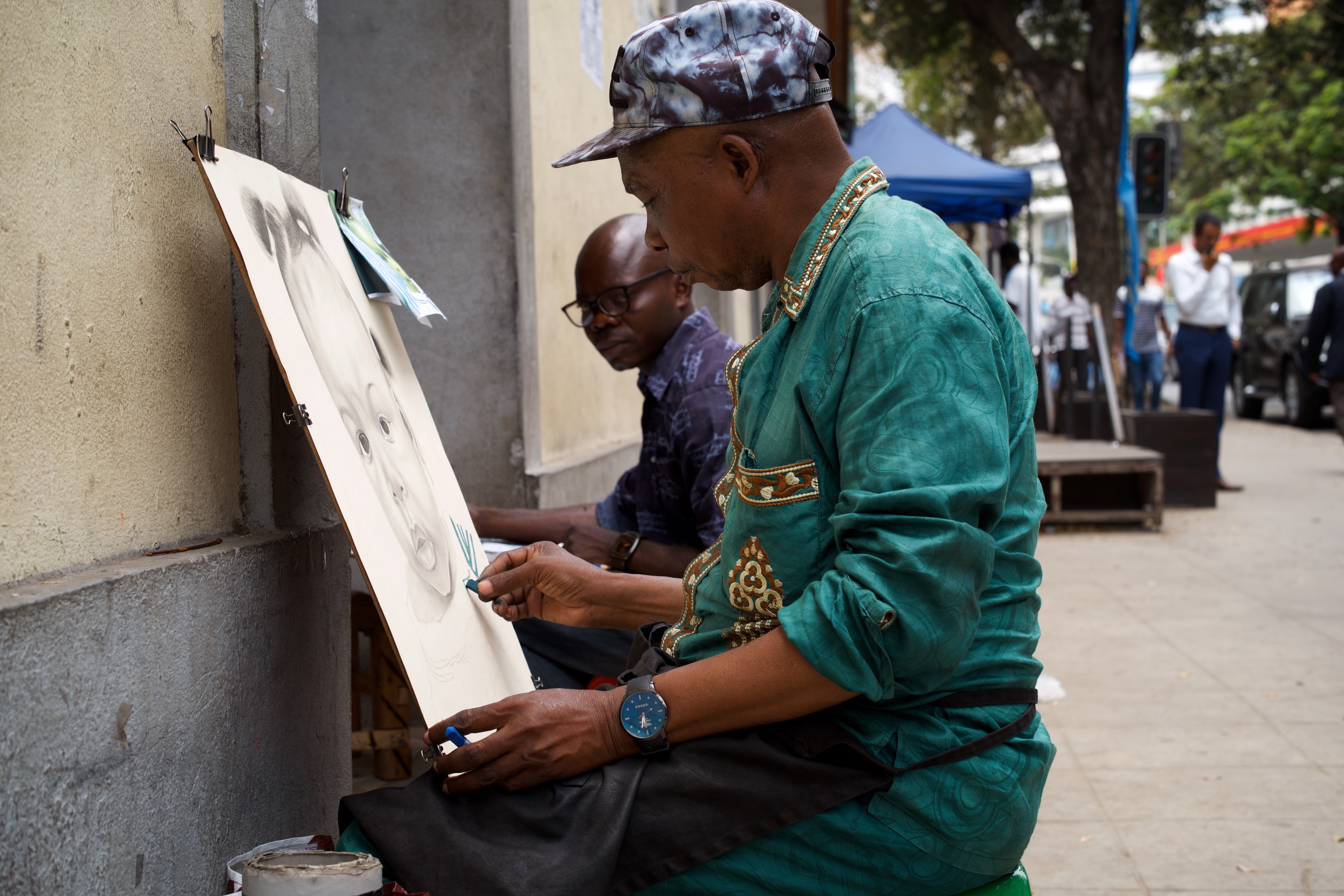 Lo lascio armeggiare sul suo Nokia che risale alle Guerre Puniche e mi avvicino a un paio di tipi che stanno disegnando, curiosamente con la faccia e la tela rivolti verso il muro. Entrambi realizzano ritratti, partendo da fotografie, e aggiungendo quello che definirei uno “stile pop-Nieto”, a credito di Agustino Nieto che ha guidato il Paese fuori dal colonialismo Portoghese. Rinuncio all’inglese e allo spagnolo: alzo la Signora Tedesca a Telemetro e annuisco con un’aria innocua. Abbassano la testa entrambi, accettando che tracci il mio ricordo, lasciando il compito al magico vetro Summilux, mentre aspettiamo che, nuovamente, Caronte arrivi per scaricarci da qualche altra parte in Africa.