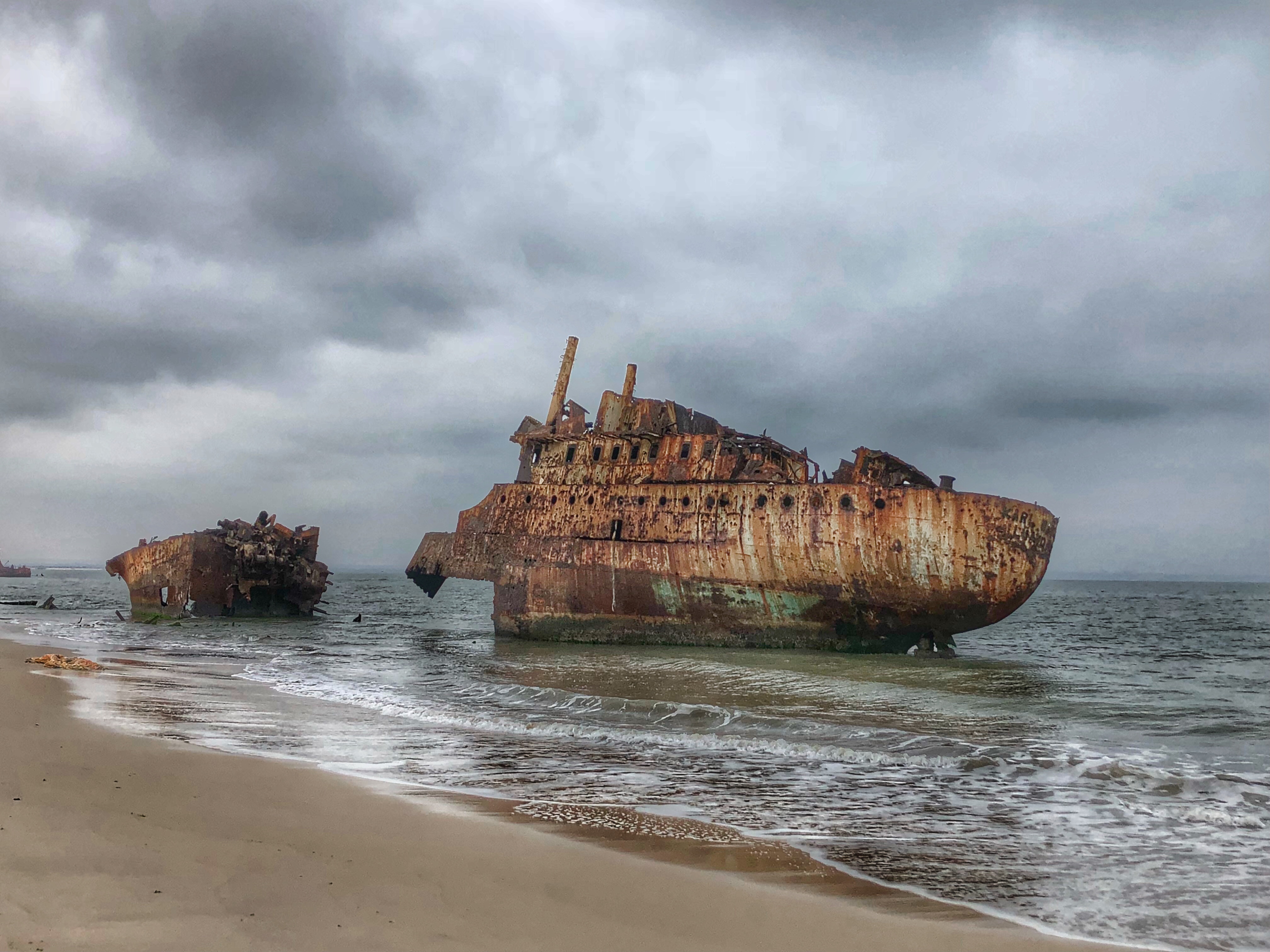 Gli scheletri arrugginiti cominciano a essere visibili, mescolandosi negli spruzzi che l’Oceano Atlantico qui unisce a nebbie continue e a forti correnti che spingono dal largo a riva, rendendo impossibile, prima dello sviluppo dei motori marittimi, riprendere la navigazione senza arenarsi bloccati per sempre.