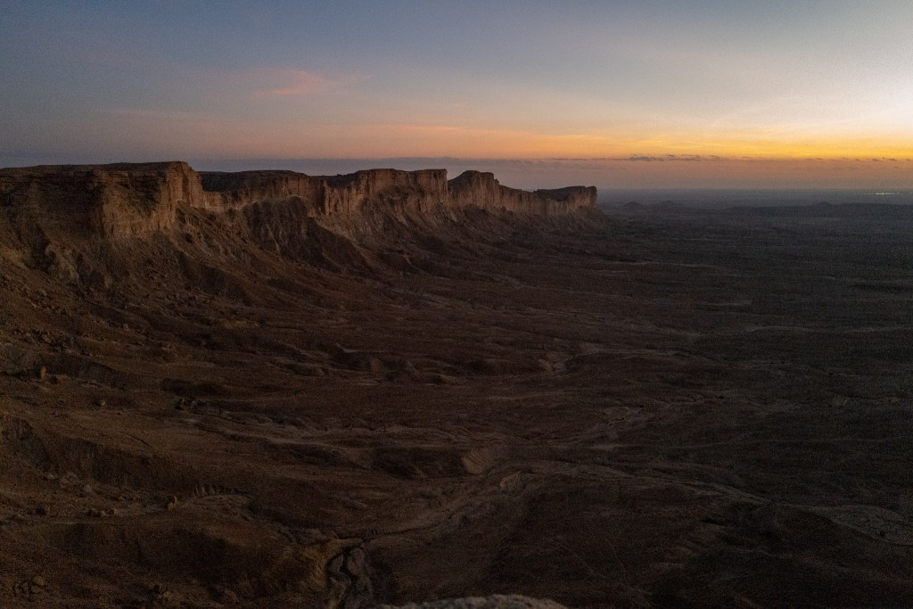 Il nome arabo, se traduco bene l’accento americano-saudita del mio Caronte, è Jamal Tuwaiq, e il posto più spettacolare dove osservare questa meraviglia naturale, è 250 chilometri a nord-ovest di Riyadh, su una punta chiamata “Edge of The World”, “Il Bordo del Mondo”. Il Kingdom of Saudi Arabia ha recentemente aperto le sue frontiere al turismo, con una nuova politica di visti di ingresso (finalmente ottenibili on-line in meno di un’ora), e con una campagna di comunicazione planetaria nel quale questo era uno dei luoghi suggeriti.