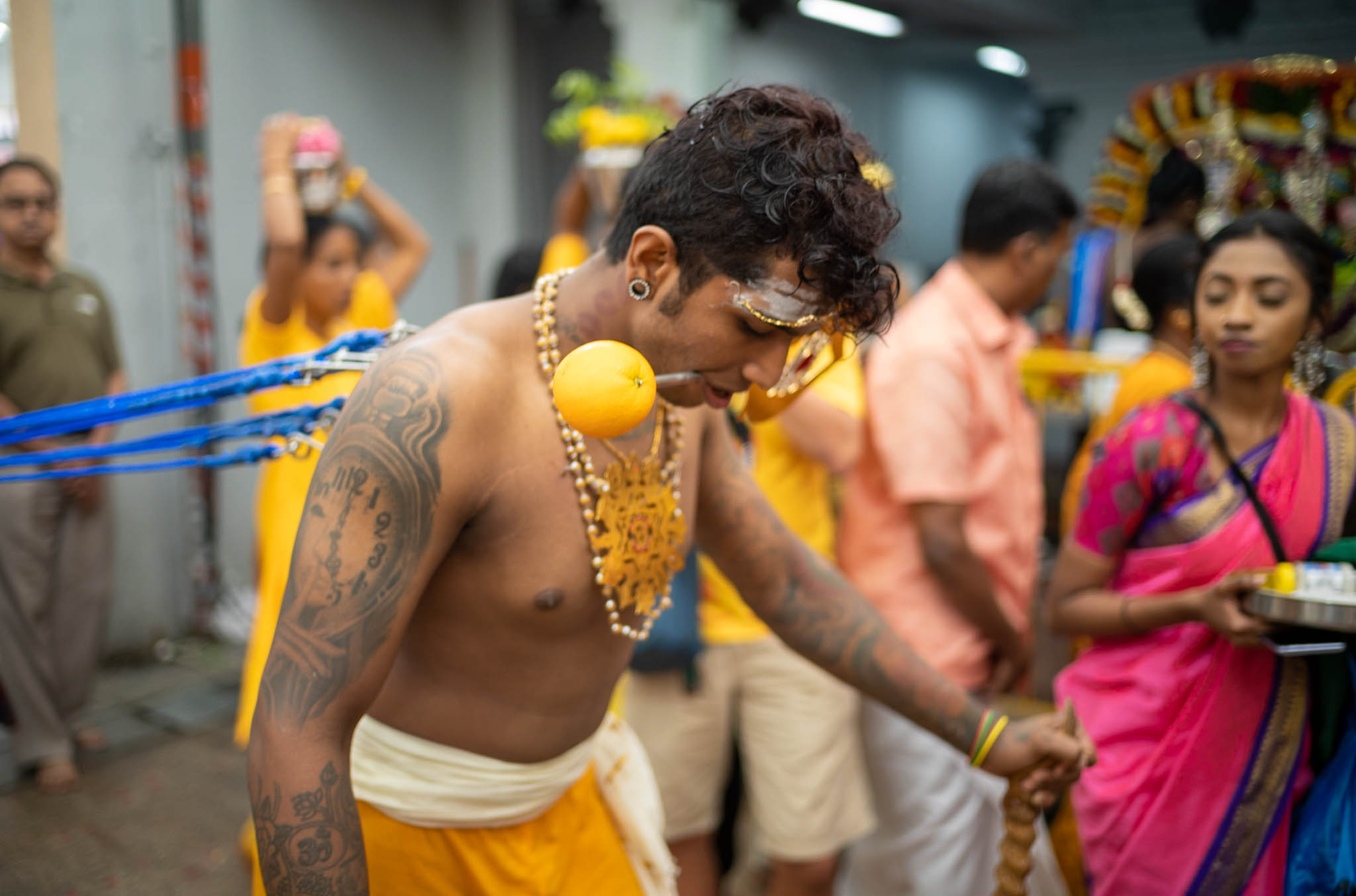 I colori caldi del giallo e dell’ arancione ma saturano le retina, mentre passo accanto a chi si sta preparando, facendosi lacerare la pelle con spiedi, spille e ganci che sembra non abbiano nessun effetto, né facciano sanguinare le ferite. Il frastuono diventa boato in alcuni istanti, facendomi perdere l’orientamento, mentre l’odore dell’intenso e delle offerte occupano tutto lo spettro olfattivo.